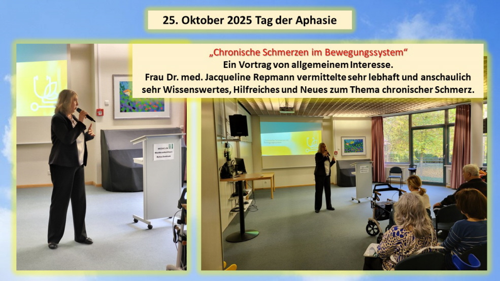 Nicht nur Betroffene und Angehörige aus den Selbsthilfe-gruppen folgten am 25. Oktober 2025 der Einladung des Aphasiker-Zentrum-Nordsachsen e.V. in die Mediclin Reha Klinik Bad Düben zum jährlichen Vereinstreffen. Auch Gäste der Reha Klinik sowie Betroffene und Interessierte der Region nutzten die Gelegenheit sich zu informieren.